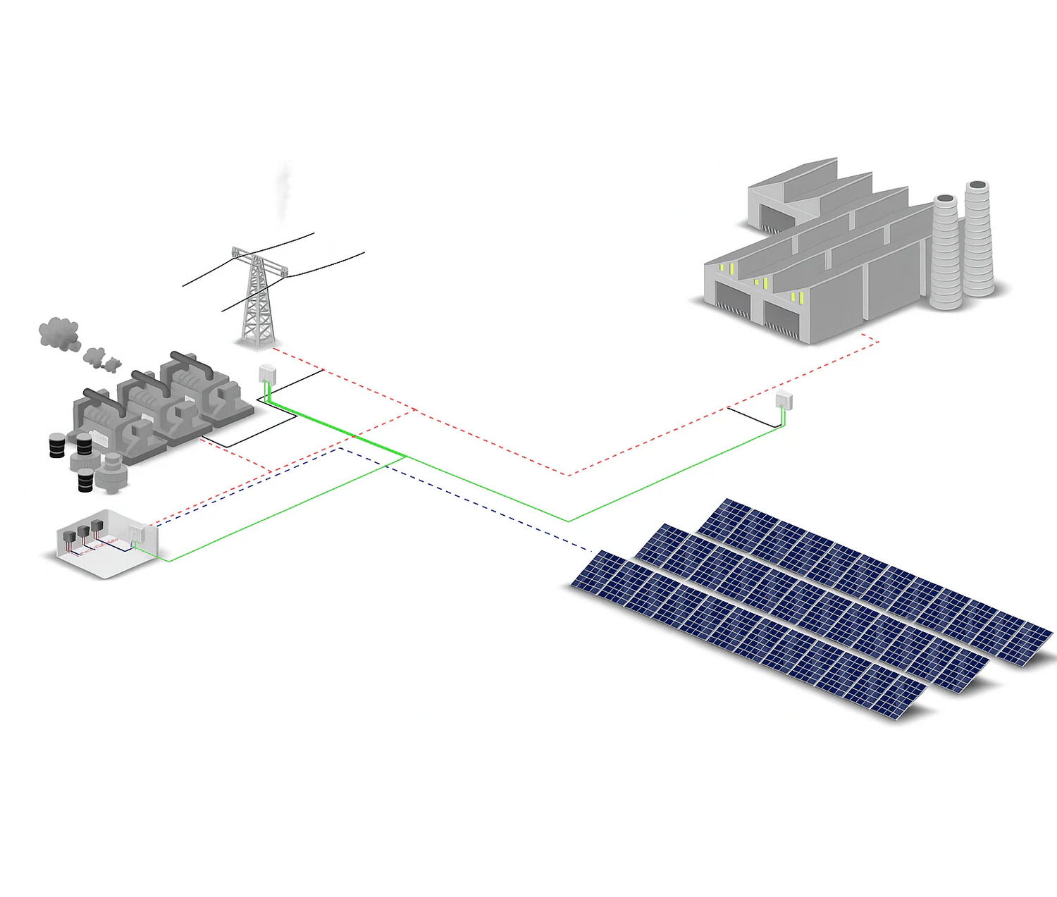- A coordinated system of solar PV, battery energy storage (BESS), and diesel/gas generators is controlled by a central Energy Management System (EMS).